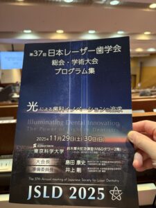 同日、東京科学大学で開催されました日本レーザー歯学会にも参加してまいりました。東京までの遠征になりました。こちらの学会では、最近の歯科用レーザーを用いた新規性のある研究、日常の診療に活かせる内容を勉強してまいりました。また安全に医療機関を使用できる環境を整えていけるための講習会も開催されていました。